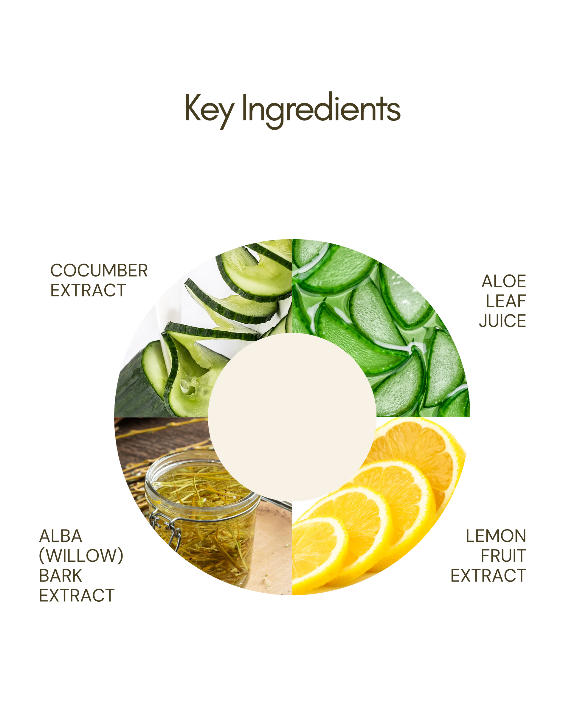 Cucumber Extract, Lemon Fruit Extract, Licorice Fruit Extract, Aloe Leaf Juice, Alba (Willow) Bark Extract